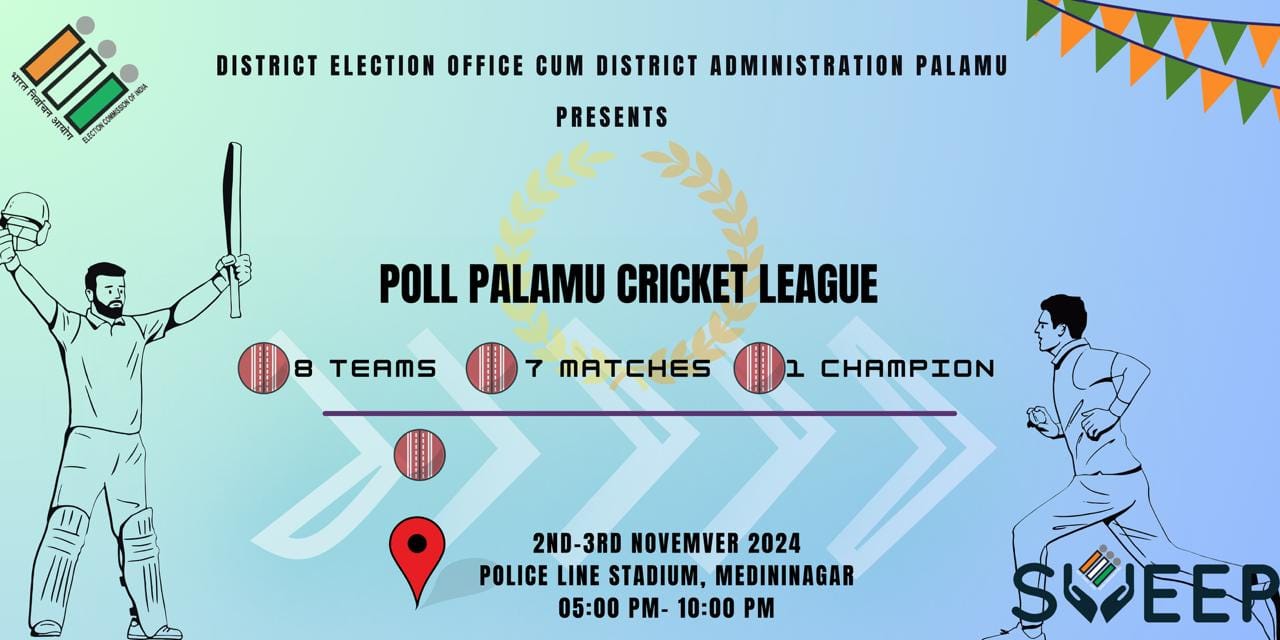 पलामू। विधानसभा निर्वाचन में अधिक से अधिक मतदान कराने व इस कार्य के लिए मतदाताओं को जागरूक करने के उद्देश्य से दो दिवसीय क्रिकेट मैच का आयोजन कराया जा रहा है। यह 2 और 3 नवंबर को गणेश लाल अग्रवाल कॉलेज के मैदान में दोपहर 3 बजे से होगा। इसमें कुल 8 टीमें हिस्सा लेंगी।