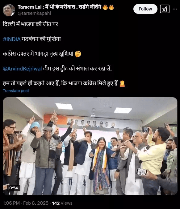 एक्स पर एक यूजर ने वीडियो को शेयर करते हुए दावा किया कि दिल्ली में बीजेपी की जीत पर कांग्रेस दफ्तर में भांगड़ा नृत्य हो रहा है।