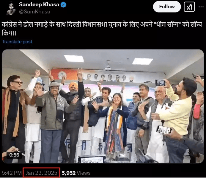 इसके अलावा न्यूज नेशन के पत्रकार मोहित राज दुबे के एक्स पर भी हमें 23 जनवरी का शेयर किया गया इससे मिलता-जुलता एक वीडियो मिला। वीडियो के साथ बताया गया कि दिल्ली विधानसभा चुनाव को लेकर कांग्रेस ने अपना थीम सॉन्ग लॉन्च किया। इस लॉन्च के दौरान पवन खेड़ा समेत कांग्रेस के कई नेताओं ने डांस किया।