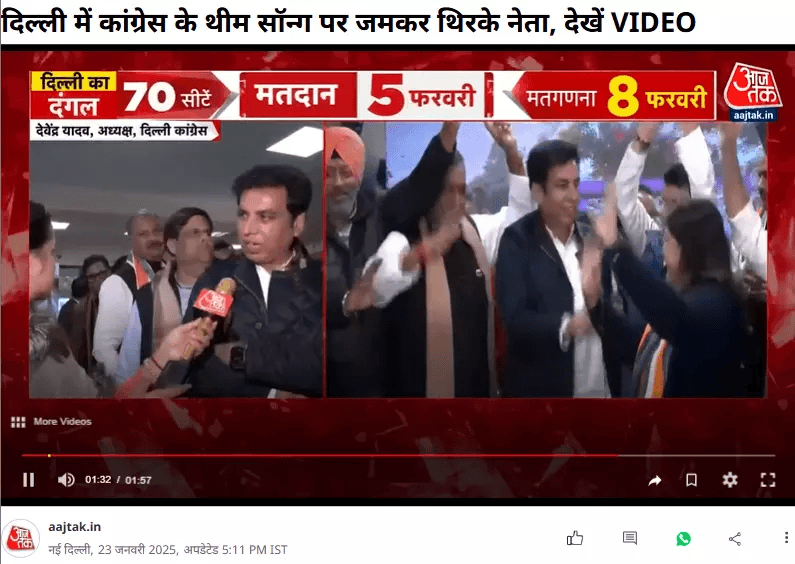 आजतक की एक वीडियो रिपोर्ट में बताया गया कि 23 जनवरी को कांग्रेस ने विधानसभा चुनाव के लिए “हर जरूरत होगी पूरी कांग्रेस है जरूरी” सॉन्ग लॉन्च किया। इस मौके पर दिल्ली प्रदेश कांग्रेस दफ्तर में अध्यक्ष देवेंद्र यादव समेत कई नेता थिरकते नजर आए।