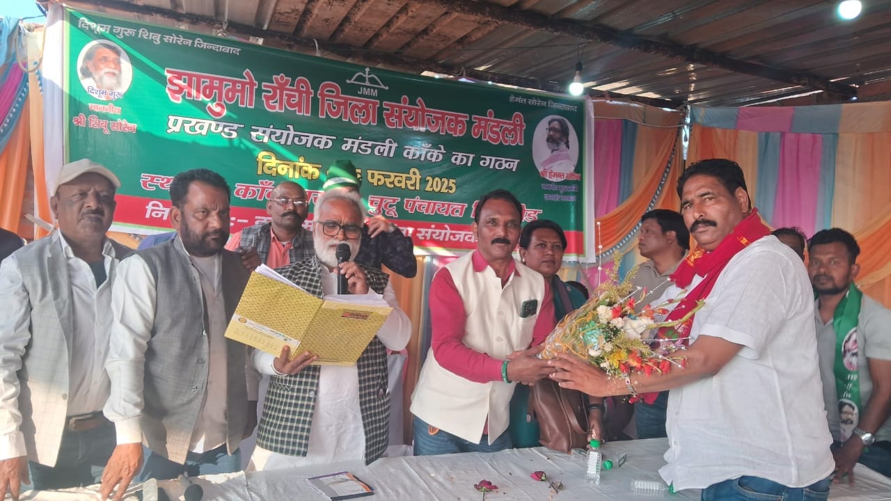 रांची। झामुमो कांके प्रखंड संयोजक मंडली के गठन को लेकर रिंग रोड चुट्टू में बैठक हुई। इसकी अध्यक्षता जिला संयोजक मुस्ताक आलम ने की। बैठक में पूर्व प्रखंड अध्यक्ष जावेद अख्तर अंसारी को संयोजक मंडल का प्रमुख बनाया गया।