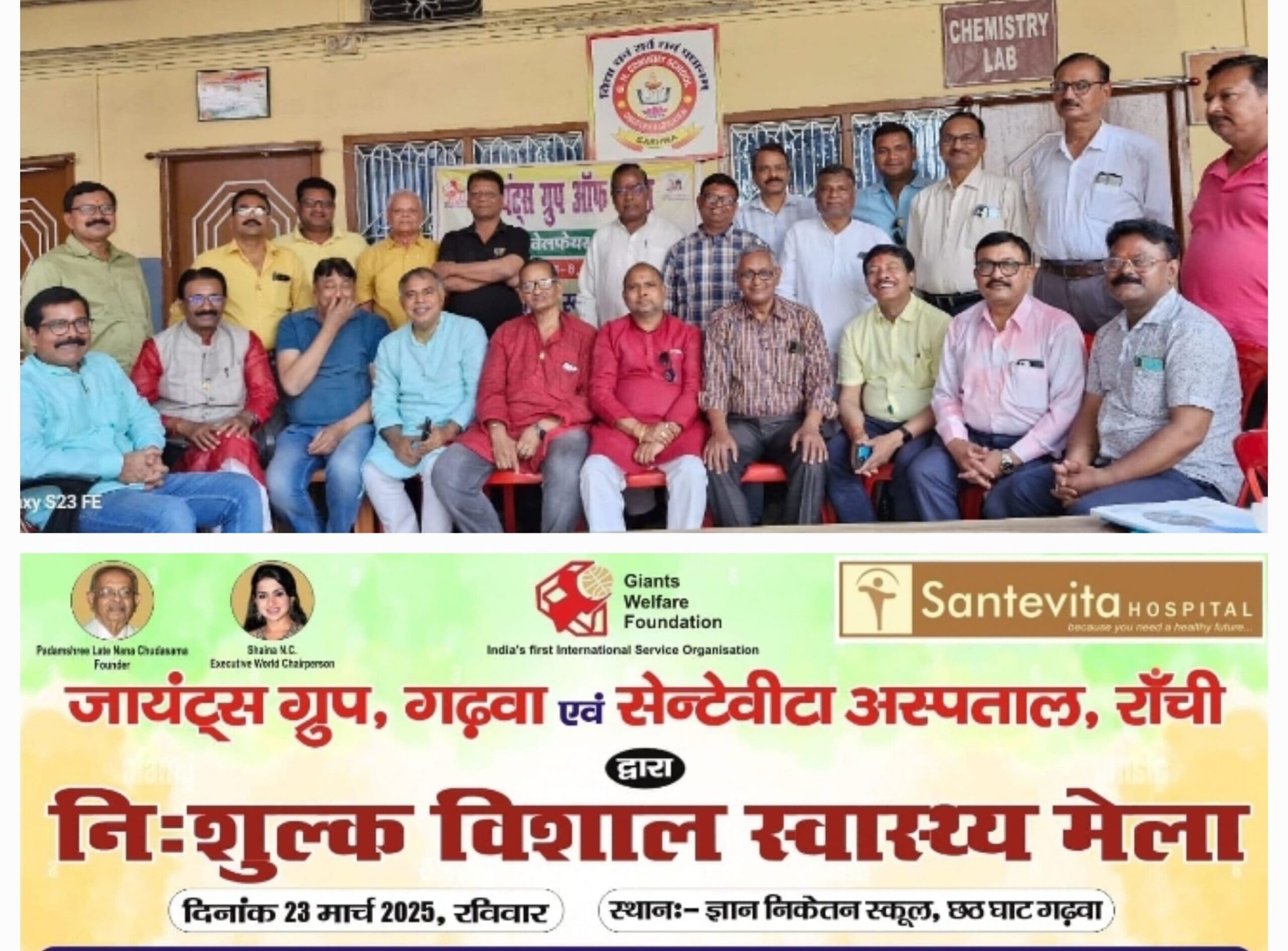 गढ़वा। जायन्ट्स ग्रुप ऑफ गढ़वा 23 मार्च, 2025 को सेंटेवीटा अस्पताल, रांची के सहयोग से मेगा मेडिकल कैंप का आयोजन किया गया है। इसे लेकर जायंट्स ग्रुप के सदस्यों की स्थानीय ज्ञान निकेतन स्कूल के सभागार में अध्यक्ष राकेश केशरी की अध्यक्षता में बैठक हुई। इसमें कैंप के सुचारू रूप से संचालन पर विचार विमर्श किया गया। साथ ही, सफल आयोजन के लिए विभिन्न समितियों का गठन किया गया।