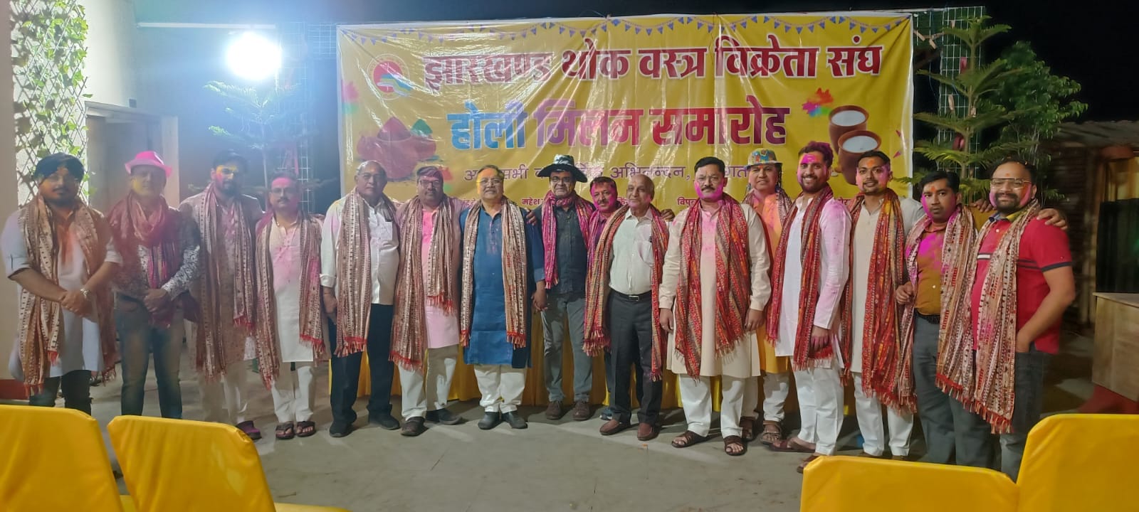 रांची। झारखंड थोक वस्त्र विक्रेता संघ के सदस्यों ने कचहरी स्थित वेंडर मार्केट में 13 मार्च को होली मिलन समारोह मनाया। इस अवसर पर संघ के सदस्यों का पदधारियों ने अंग वस्त्र देकर अबीर, गुलाल लगाकर उनका अभिनंदन और स्वागत किया। इस अवसर पर फूलों के साथ भी होली खेली।
