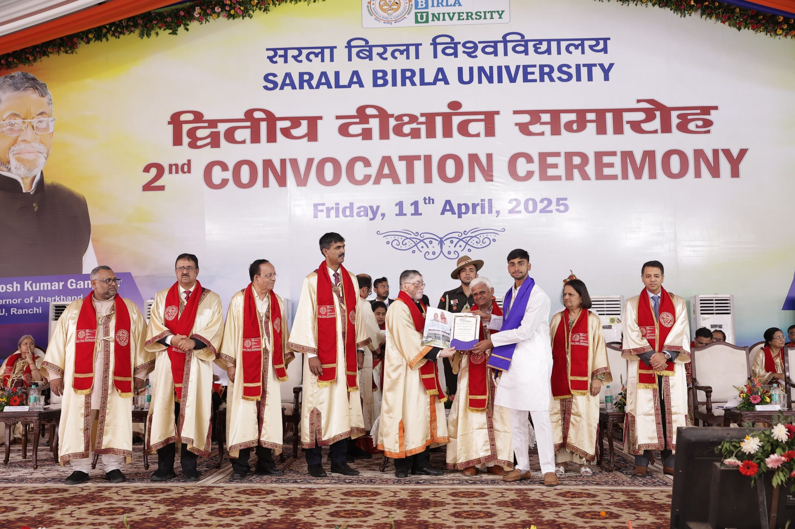 रांची। सरला बिरला विश्वविद्यालय के द्वितीय दीक्षांत समारोह में राज्यपाल संतोष कुमार गंगवार ने 11 अप्रैल को 43 छात्रों को ‘बसंत कुमार सरला बिरला स्वर्ण पदक’ और पांच को पीएचडी की डिग्री दी। इसके साथ ही विभिन्न संकायों के 1664 छात्रो को डिग्री दी गई। दीक्षांत समारोह में मिलेट मैन ऑफ़ इंडिया के नाम से चर्चित डॉ खादर वल्ली को पीएचडी की मानद उपाधि प्रदान की गई।