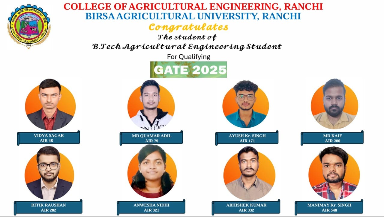 रांची। बिरसा कृषि विश्वविद्यालय के कृषि अभियंत्रण महाविद्यालय के 8 छात्र-छात्राओं ने ग्रेजुएट एप्टीच्यूड टेस्ट इन इंजीनियरिंग (गेट) की परीक्षा में सफलता प्राप्त की है I राष्ट्रीय स्तर की यह परीक्षा आइआइटी रुड़की ने आयोजित की थी I