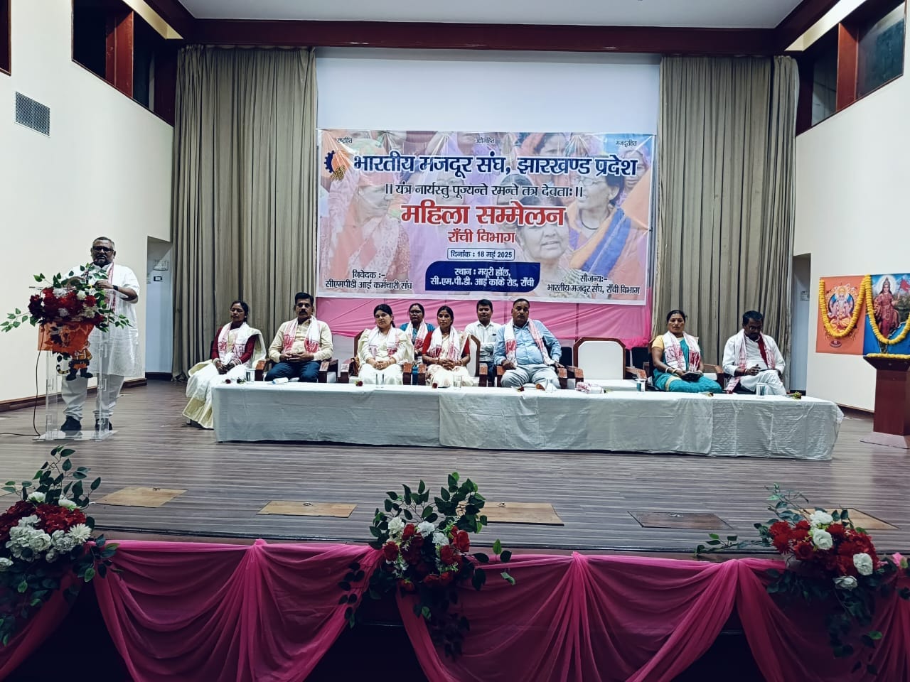 रांची। भारतीय मजदूर संघ (बीएमएस) झारखंड प्रदेश का महिला सम्मेलन 18 मई को कांके रोड स्थित सीएमपीडीआई के मयूरी प्रेक्षागृह में हुआ। इसकी अध्यक्षता श्रीमती प्रमिला देवी ने की। रांची विभाग के अंतर्गत रांची, रामगढ़ और खूंटी जिलों की महिला कार्यकर्ताओं के लिए यह कार्यक्रम हुआ। कार्यक्रम में मुख्य अतिथि के रूप में राज्यसभा सांसद प्रदीप वर्मा, प्रदेश महामंत्री राजीव रंजन, संगठन मंत्री ब्रजेश और राष्ट्रीय सेविका समिति की प्रांत प्रचार प्रमुख डॉ. जिज्ञासा ओझा उपस्थित थे। मंच संचालन प्रदेश उपाध्यक्ष श्रीमती रंजना शरण ने किया।