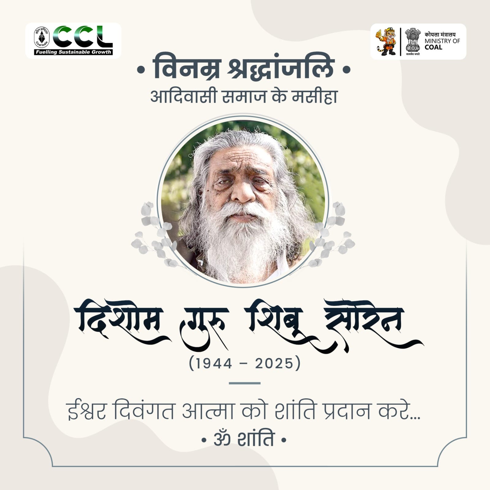 रांची। सेंट्रल कोलफील्ड्स लिमिटेड (सीसीएल) परिवार ने आदिवासी समाज के मसीहा, पूर्व केंद्रीय कोयला मंत्री, झारखंड के पूर्व मुख्यमंत्री एवं वर्तमान राज्यसभा सांसद दिशोम गुरु शिबू सोरेन के निधन पर गहरा शोक व्यक्त किया। उनके निधन को राज्य की सामाजिक, राजनीतिक और सांस्कृतिक चेतना के लिए अपूर्णीय क्षति बताया।