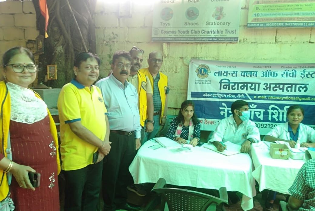 रांची। लायंस क्लब ऑफ़ रांची ईस्ट निरामया अस्पताल ने कॉसमॉस यूथ क्लब, वर्धमान कंपाउंड के सदस्यों एवं आसपास के लोगों के लिए स्वास्थ्य जांच शिविर का आयोजन लालपुर स्थित कॉसमॉस क्लब परिसर में किया। शिविर में लगभग 50 लोगों ने रक्तचाप, नेत्र, डायबिटीज एवं सामान्य जांच कराई। लगभग 10 लोगों की आंखों में मोतियाबिंद के लक्षण पाए गए। उन्हें कोकर स्थित निरामया अस्पताल में आगे की सलाह के लिए बुलाया गया।