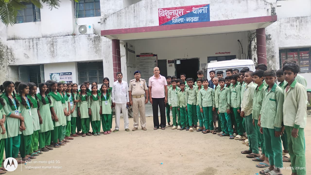 बिशुनपुरा। पीएम श्री उत्क्रमित मध्य विद्यालय, अमहर खास के वर्ग आठ के लगभग 60 छात्र-छात्राओं ने शुक्रवार को बिशुनपुरा थाना भवन का शैक्षणिक भ्रमण किया। इस दौरान विद्यालय के प्रधानाध्यापक सुबोध कुमार द्विवेदी के नेतृत्व में बच्चे थाना परिसर पहुंचे।