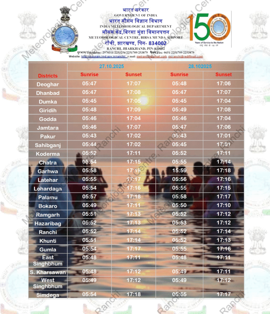 अर्घ्य देने के समय सूर्योदय और सूर्यास्त के समय का काफी महत्व होता है। छठव्रती सहित सभी श्रद्धालु इसे जानना चाहते हैं। इसके मद्देनजर रांची एयरपोर्ट स्थित मौसम केंद्र ने झारखंड के सभी जिलों के सूर्योदय और सूर्यास्त की समय सारिणी जारी की है।