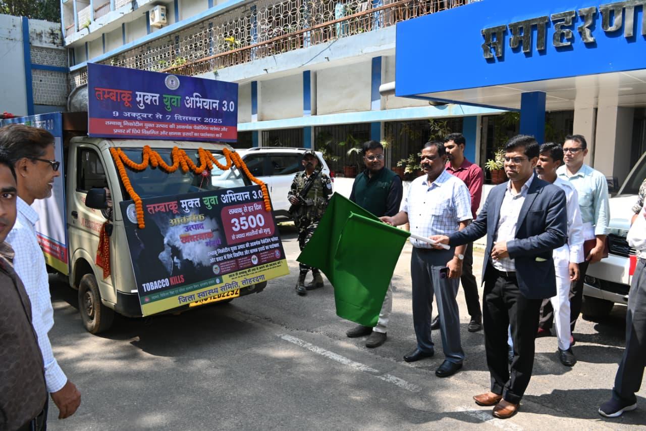 लोहरदगा। उपायुक्त डॉ ताराचंद ने गुरुवार को तम्बाकू मुक्त युवा अभियान 3.0 का शुभारंभ जागरुकता रथ को रवाना कर किया। उपायुक्त ने समाहरणालय परिसर इस जागरुकता रथ को हरी झंडी दिखाकर रवाना किया। समाहरणालय परिसर में हस्ताक्षर अभियान भी चलाया गया।