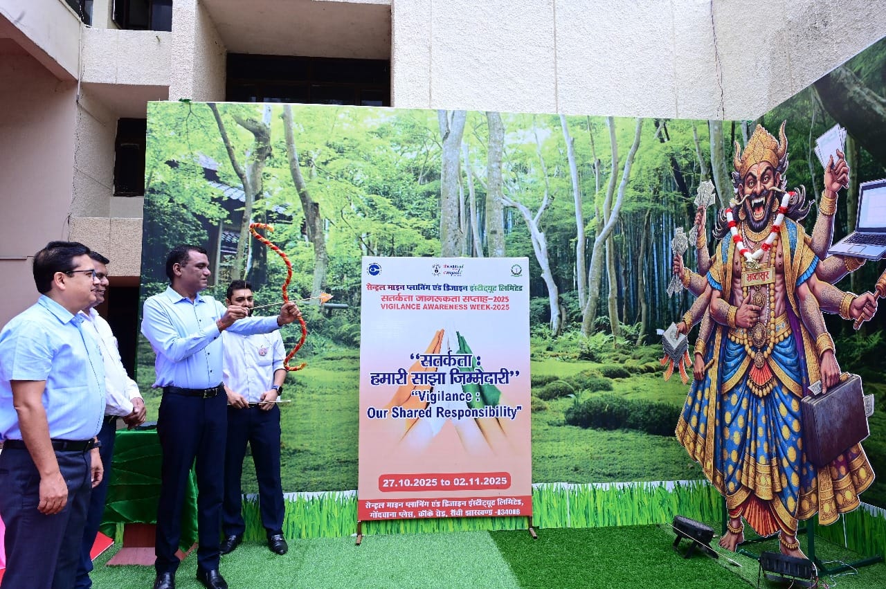 रांची। सीएमपीडीआई ने कर्मियों को सत्यनिष्ठा की शपथ दिलाकर सतर्कता जागरुकता सप्ताह 2025 की शुरुआत की। संस्थान के निदेशक (तकनीकी/सीआरडी) शंकर नागाचारी ने निदेशक (तकनीकी/पीएंडडी/आरडीएंडटी) अजय कुमार और सीएमपीडीआई व सीसीएल के मुख्य सतर्कता अधिकारी की उपस्थिति में अपने कर्मियों को शपथ दिलायी।