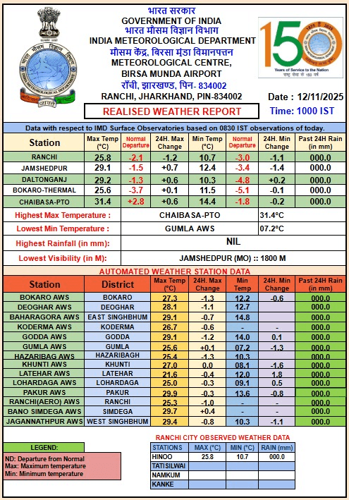 Jharkhand Weather : रांची। झारखंड में सर्दी ने रंग दिखाना शुरू कर दिया है। तापमान में अचानक लगातार गिरावट दर्ज की जा रही है। सुबह 10 बजे से न्यूनतम तापमान 7.2 डिग्री सेल्सियस दर्ज किया गया। न्यूनतम तापमान सामान्य से 5.1 डिग्री सेल्सियस कम दर्ज किया गया है।