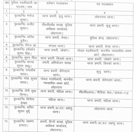 लोहरदगा। पुलिस अधीक्षक ने जिले के कई थाना प्रभारी का तबादला कर दिया है। इसका आदेश गुरुवार को जारी किया गया। इसे तत्काल प्रभाव से लागू किया गया है।