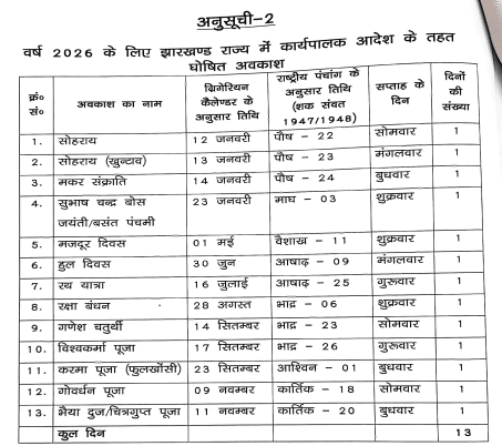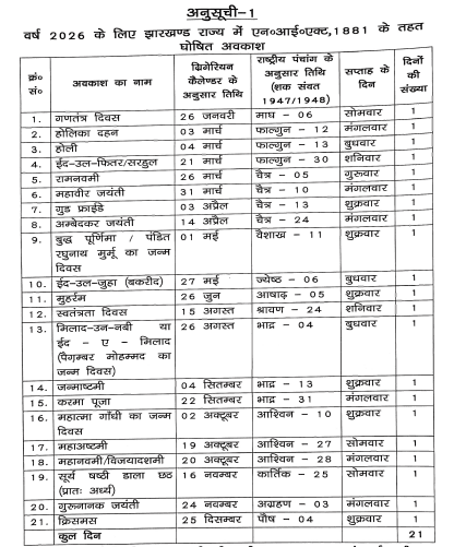 रांची। अगले साल यानी 2026 में झारखंड के सरकारी कर्मचारियों की छुट्टी 12 जनवरी से शुरू होंगी। छुट्टियों की सूची कार्मिक विभाग के संयुक्त सचिव आसिफ हसन ने 10 दिसंबर, 2025 को जारी कर दी है।