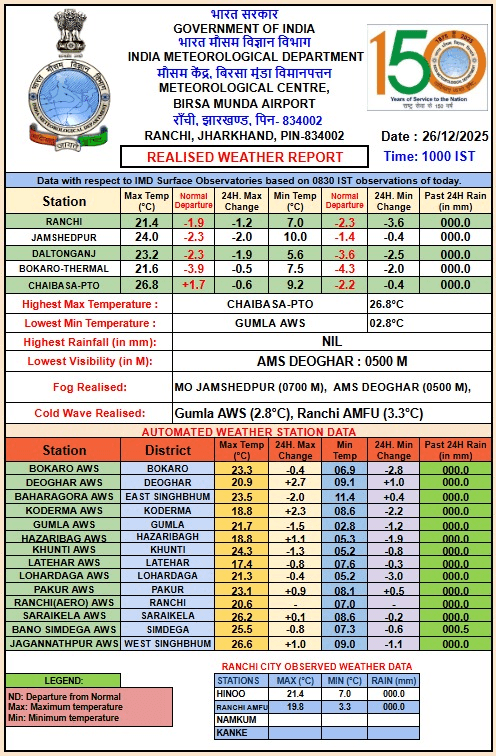 Jharkhand Weather : रांची। झारखंड में सर्दी बढ़ती ही जा रही है। तापमान तेजी से नीचे गिर गया है। न्यूनतम तापमान सामान्य से कम दर्ज किया जा रहा है। आज सुबह 10 बजे गुमला का न्यूनतम तापमान 2.8 डिग्री सेल्सियस दर्ज किया गया।