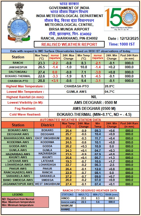 Jharkhand Weather : रांची। झारखंड में सर्दी बढ़ती ही जा रही है। तापमान तेजी से नीचे गिर गया है। आज कांके का न्यूनतम तापमान 3.0 डिग्री सेल्सियस दर्ज किया गया। न्यूनतम तापमान सामान्य से 6.1 डिग्री सेल्सियस कम दर्ज किया गया है।