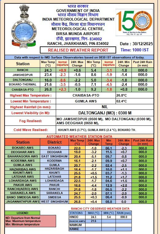 Jharkhand Weather : रांची। झारखंड में सर्दी बढ़ती ही जा रही है। तापमान तेजी से नीचे गिर गया है। न्यूनतम तापमान सामान्य से कम दर्ज किया जा रहा है। आज सुबह 10 बजे गुमला का न्यूनतम तापमान 2.4 डिग्री सेल्सियस दर्ज किया गया।