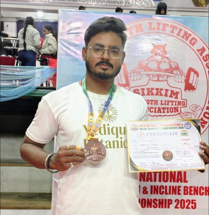 रांची। सरला बिरला विश्वविद्यालय के बीबीए पांचवें सेमेस्टर के छात्र प्रत्युष कुमार ने 35वीं राष्ट्रीय स्ट्रेन्थ लिफ्टिंग एवं इंक्लाइन बेंच प्रेस चैंपियनशिप 2025 में कांस्य पदक (तीसरा स्थान) प्राप्त किया है। यह प्रतियोगिता 11 से 13 नवंबर 2025 तक पालजोर स्टेडियम, गंगटोक, सिक्किम में आयोजित की गई थी।