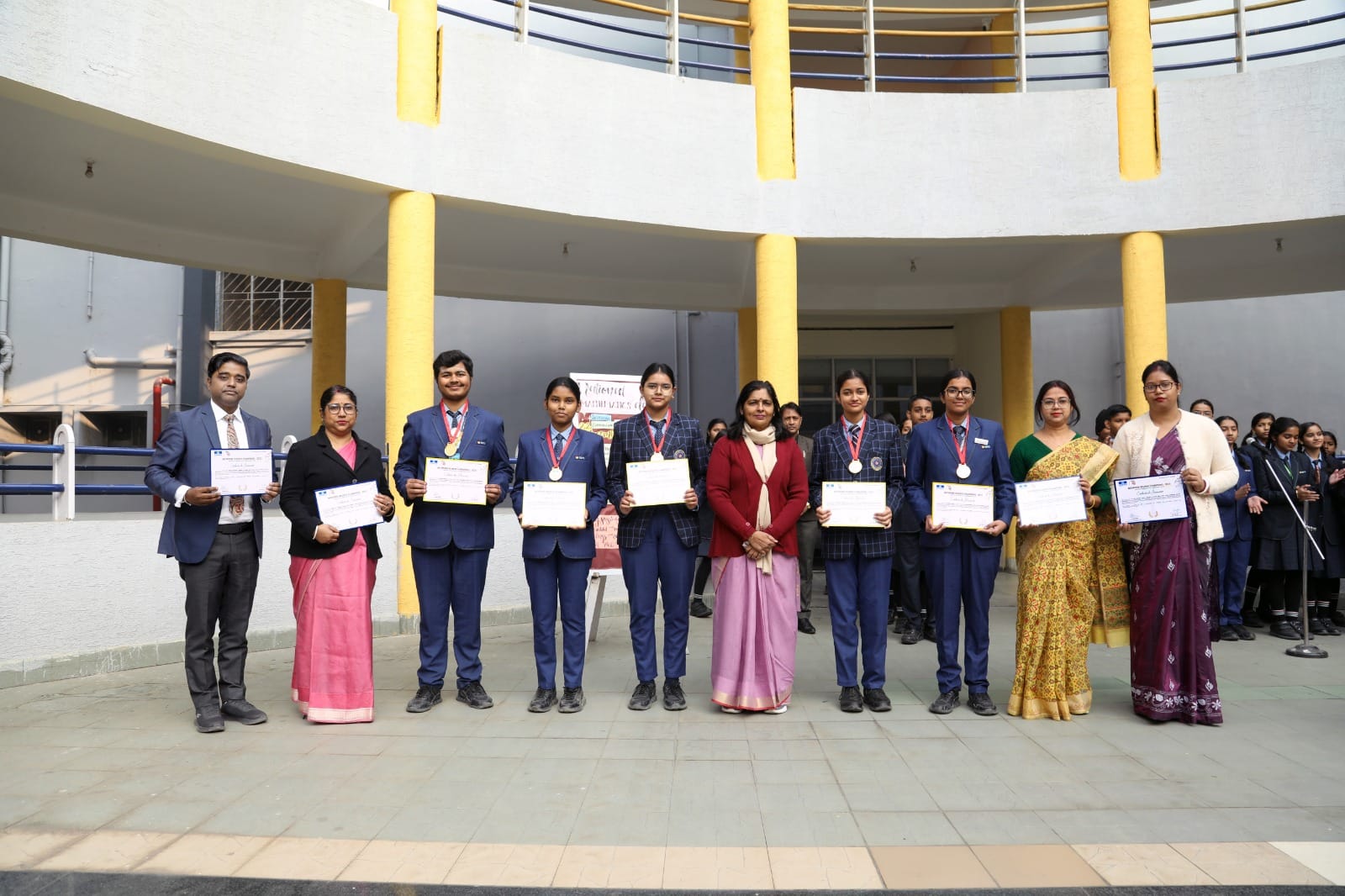 विद्यालय की शिक्षिका सिम्मी जायसवाल, निधि पारीक और शिक्षिक राकेश बर्णवाल को छात्रों के मार्गदर्शन और निरंतर समर्थन के लिए प्रमाणपत्र प्रदान किए गए।