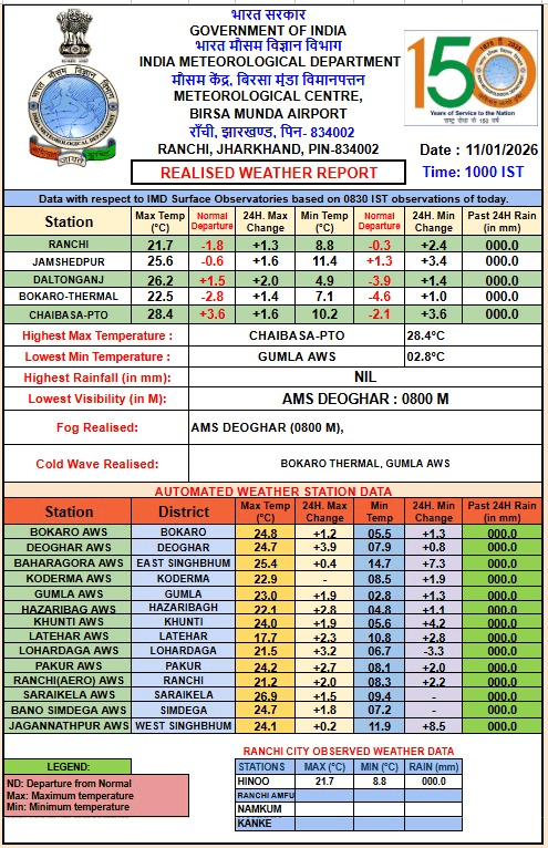 Jharkhand Weather : रांची। झारखंड में सर्दी चरम पर पहुंच गई है। पारा तेजी से गिर रहा है। कई जिलों में शीतलहर चल रही है। न्यूनतम तापमान सामान्य से कम दर्ज किया जा रहा है। आज सुबह 10 बजे राज्य का गुमला सबसे ठंडा जिला दर्ज किया गया। यहां का न्यूनतम तापमान 2.8 डिग्री सेल्सियस दर्ज किया गया।