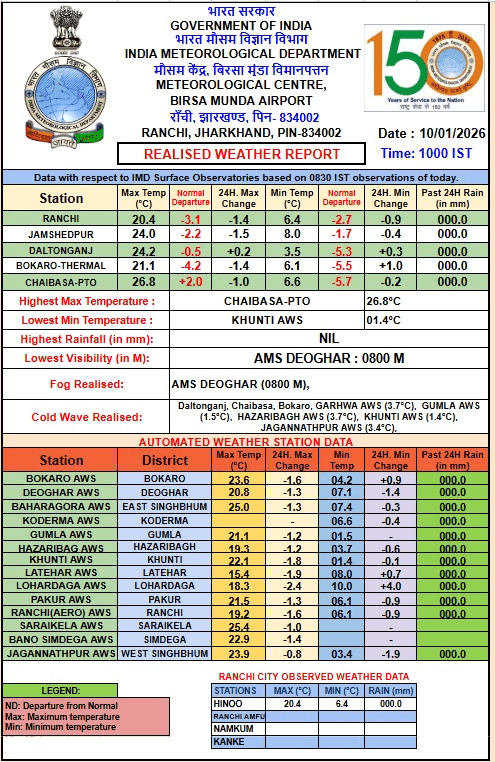 Jharkhand Weather : रांची। झारखंड में सर्दी चरम पर पहुंच गई है। पारा तेजी से गिर रहा है। कई जिलों में शीतलहर चल रही है। न्यूनतम तापमान सामान्य से कम दर्ज किया जा रहा है। आज सुबह 10 बजे राज्य का खूंटी सबसे ठंडा जिला दर्ज किया गया। यहां का न्यूनतम तापमान 1.4 डिग्री सेल्सियस दर्ज किया गया।