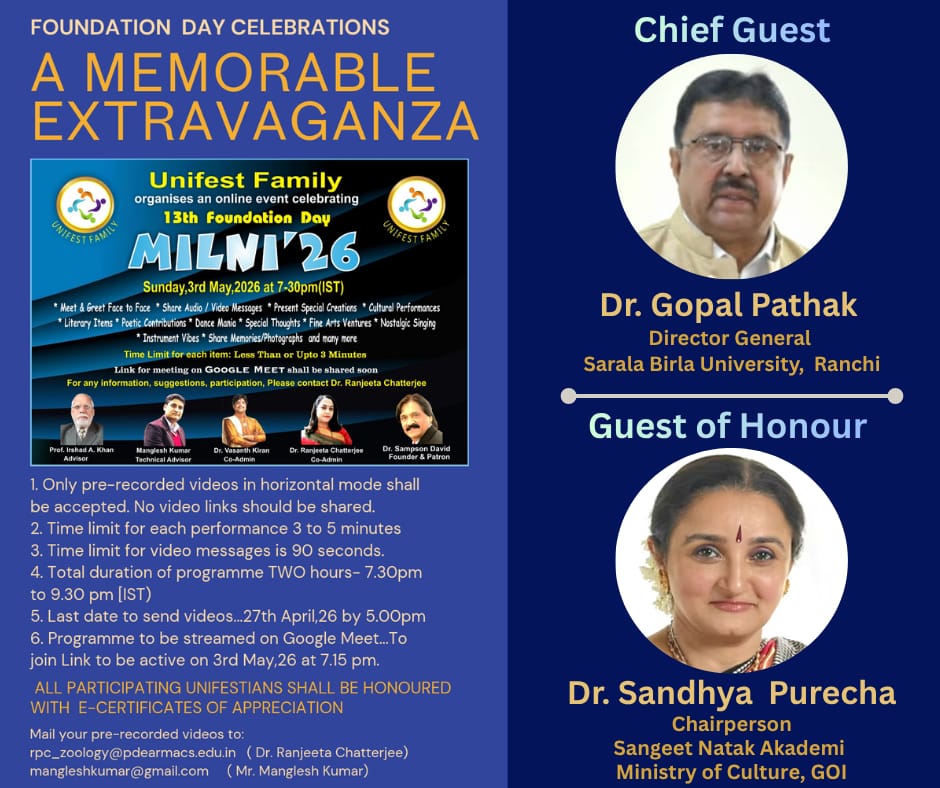 रांची। यूनिफेस्ट फैमिली द्वारा अपने 13वें स्थापना दिवस पर आयोजित भव्य सांस्कृतिक कार्यक्रम ‘मिलनी’ का आयोजन 3 मई 2026 को किया गया है। इस अवसर पर सरला बिरला विश्वविद्यालय के महानिदेशक प्रो. गोपाल पाठक मुख्य अतिथि होंगे।