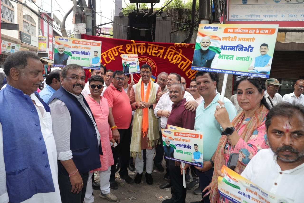 इस अभियान में संजय सेठ के संग फेडरेशन चैंबर, गांधी चौक, झारखंड थोक वस्त्र विक्रेता संघ के सदस्यों ने अपर बाजार, कुंजलाल स्ट्रीट, कपड़ा पट्टी, मारवाड़ी टोला का भ्रमण कर सभी प्रतिष्ठानों, ऑफिसों में पम्पलेट लगाकर स्वदेशी उत्पाद बेचने व भारत को आत्मनिर्भर बनाने के लिए प्रेरित किया।
