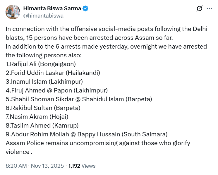 असम के मुख्यमंत्री हिमंता बिस्वा सरमा ने ट्वीट किया, “आपत्तिजनक सोशल-मीडिया पोस्ट के संबंध में, पूरे असम में अब तक 15 लोगों को गिरफ्तार किया गया है…”
