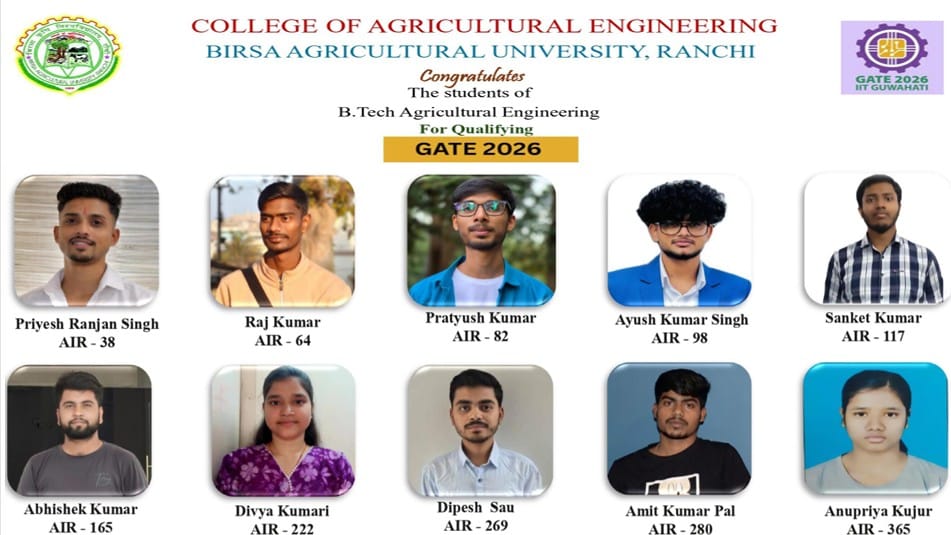 रांची। बिरसा कृषि विश्वविद्यालय (बीएयू) के कृषि अभियंत्रण महाविद्यालय (सीएई) के दस छात्रों ने ग्रेजुएट एप्टीट्यूड टेस्ट इन इंजीनियरिंग (गेट) 2026 में सफलता प्राप्त की है।