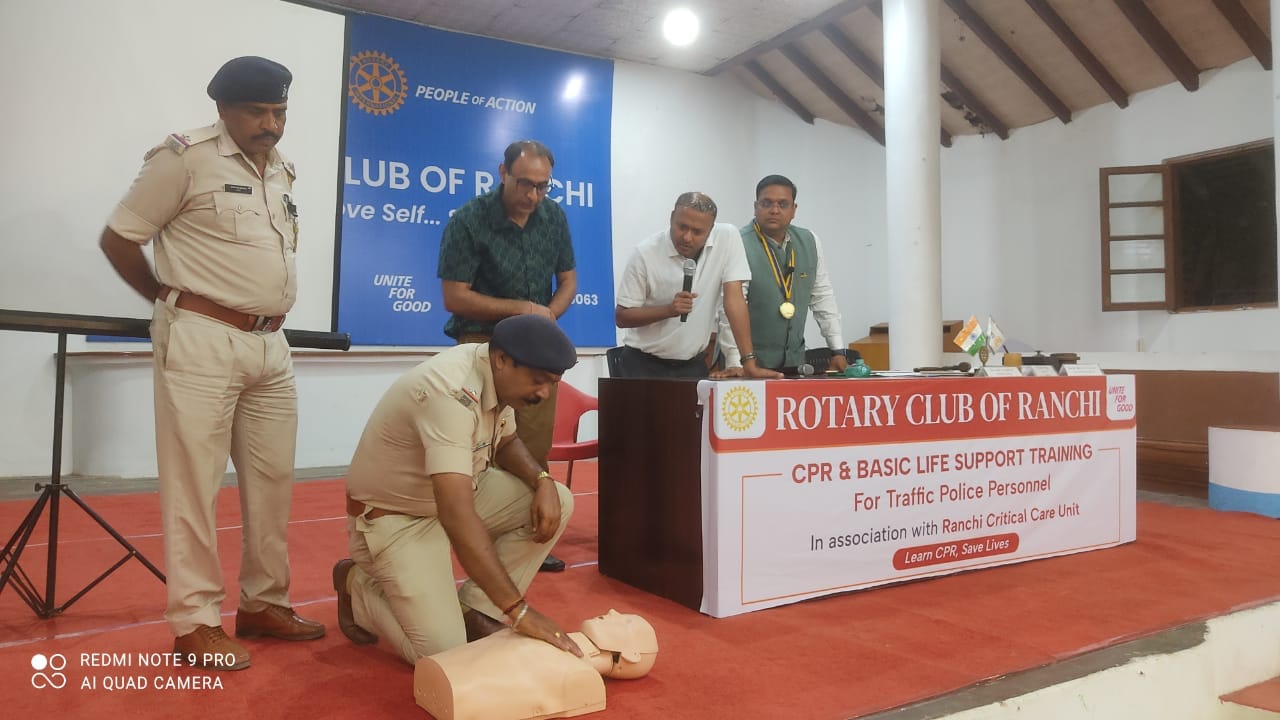 रांची। सड़क सुरक्षा और आपातकालीन स्थितियों में जीवन बचाने को लेकर रोटरी क्लब ऑफ रांची ने विशेष प्रशिक्षण सत्र आयोजित किया। इसमें 50 से अधिक ट्रैफिक पुलिस कर्मियों को कार्डियो पल्मोनरी रिससिटेशन (सीपीआर) एवं बेसिक लाइफ सेविंग तकनीकों के बारे में जानकारी दी गई।
